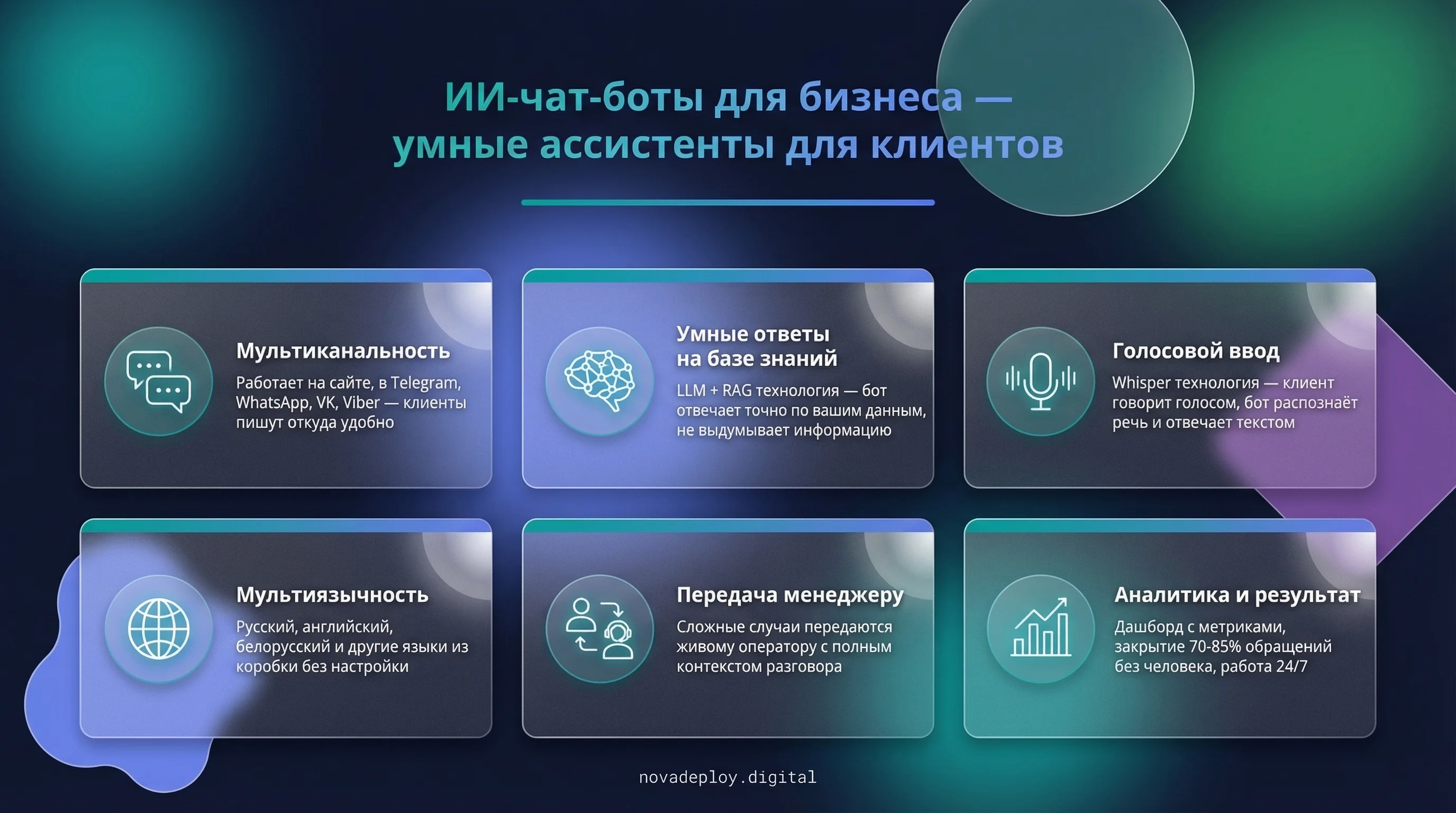 По данным телеметрии NovaDeploy за 2024-2025 годы, ИИ чат-боты снижают нагрузку на операторов первой линии на 65-80% и обрабатывают до 92% типовых запросов без эскалации. Средний срок окупаемости внедрения составляет 4-7 месяцев для компаний с потоком более 500 обращений в сутки.