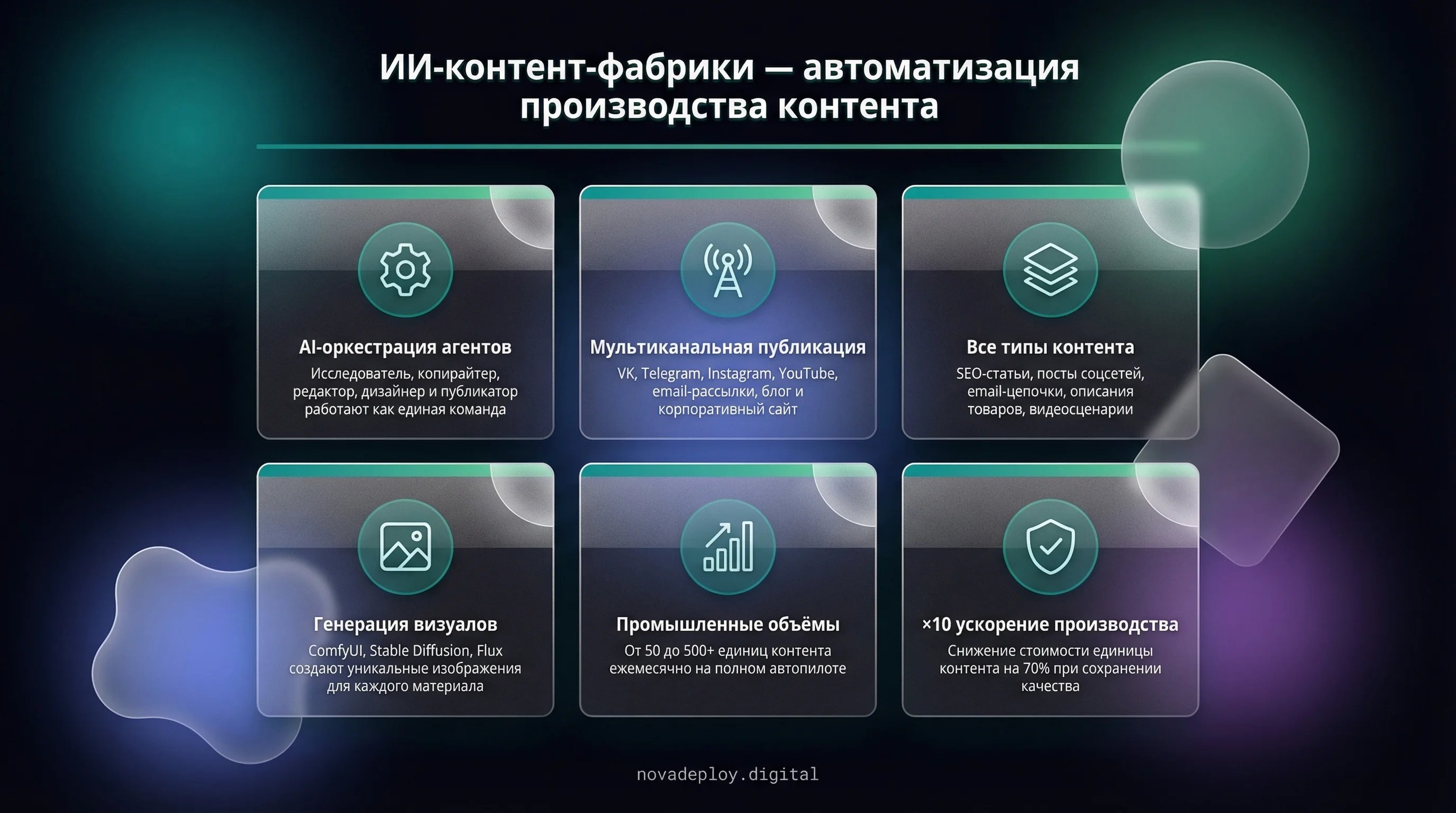 Команда NovaDeploy запускает орбитальный конвейер контента для вашего бизнеса. ИИ контент-фабрики автоматизируют создание текстов, визуалов и мультимедиа, сохраняя голос бренда и соответствие стандартам качества. Мы настраиваем генеративные модели под ваши задачи: от карточек товаров до аналитических статей. Система работает как модуль генерации на орбите — непрерывно производит контент по заданным параметрам, освобождая редакцию от рутины и ускоряя выход публикаций в 5-8 раз.
