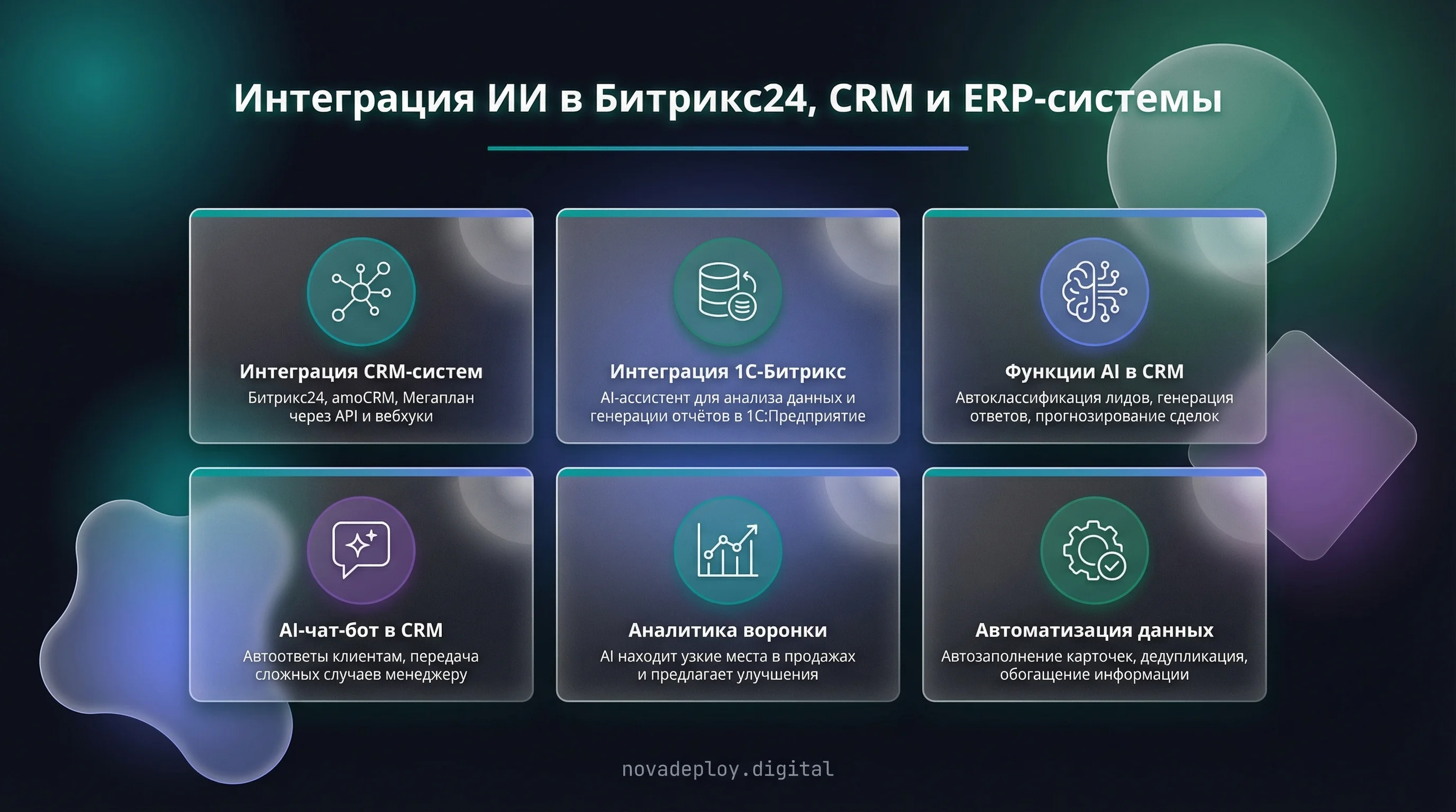 Интеграция искусственного интеллекта в корпоративные системы управления открывает новые возможности для автоматизации бизнес-процессов. Команда NovaDeploy выполняет стыковку ИИ-модулей с CRM и ERP платформами, создавая единую орбиту данных для вашего бизнеса. Мы работаем с 1C:ERP, 1C:Бухгалтерия, 1C:УТ и другими корпоративными системами, обеспечивая прозрачную интеграцию без потери существующих данных. Наш подход базируется на балансе трёх параметров: сроки, качество и цена — вы выбираете приоритеты, мы реализуем решение.