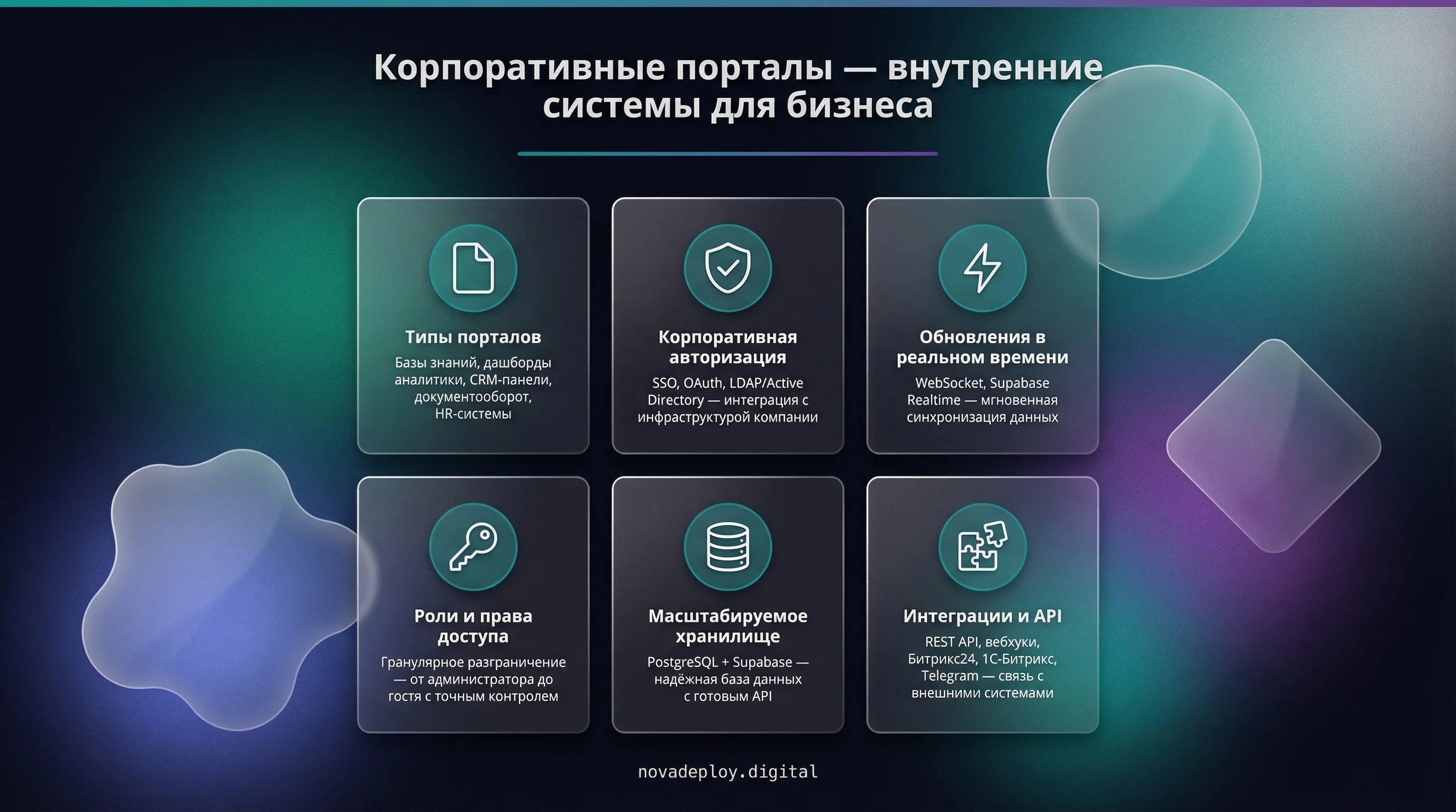 По данным исследований внедрений 2024 года, типичный корпоративный портал в компании от 200 сотрудников взаимодействует с CRM, ERP, системами документооборота, HR-платформами, складским учётом и внешними API. Команда NovaDeploy проектирует архитектуру интеграций на этапе технического задания, чтобы избежать узких мест при масштабировании.