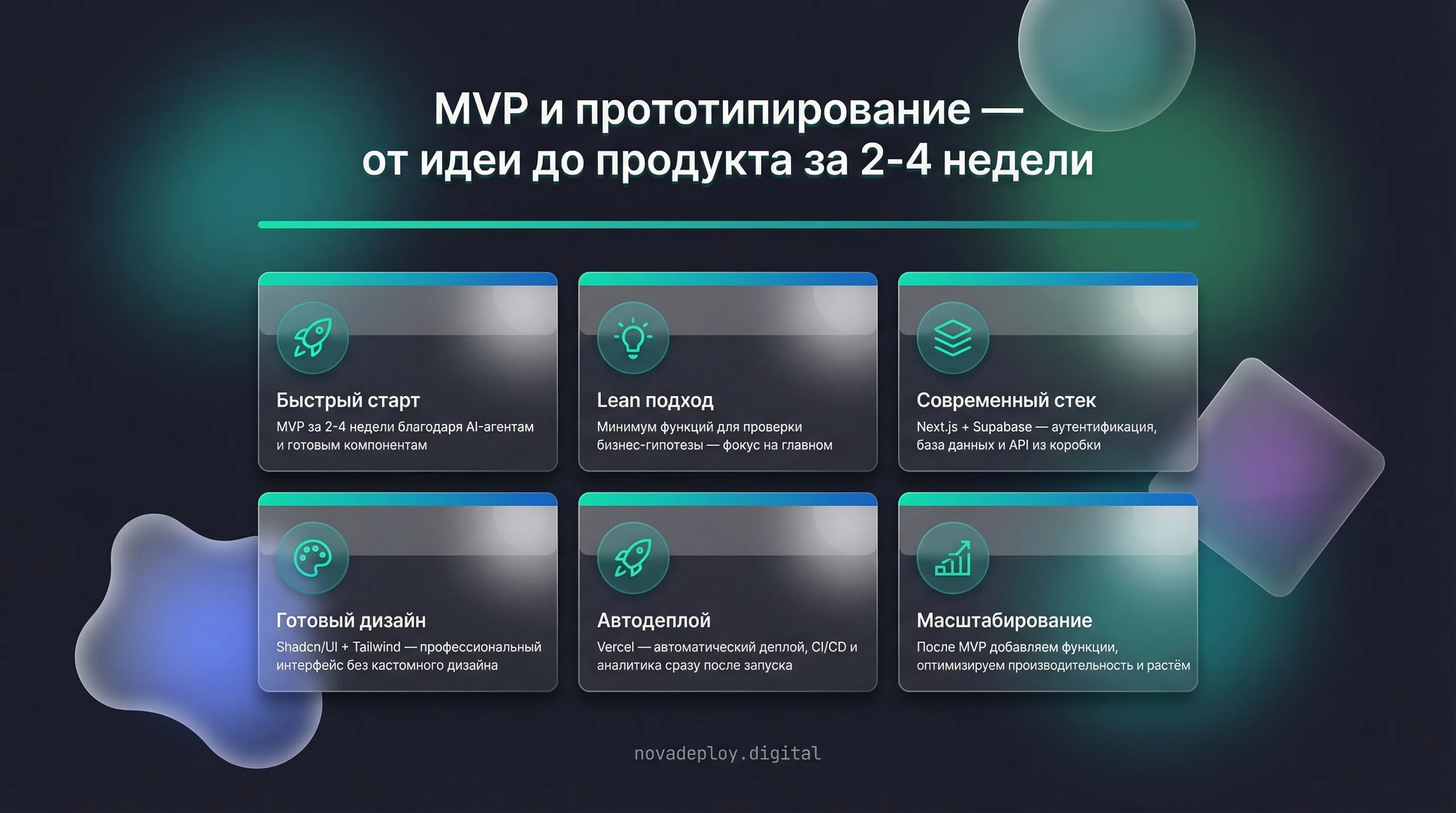 Команда NovaDeploy запускает минимально жизнеспособные продукты и прототипы для стартапов и корпораций. Мы строим тестовые конфигурации, которые выходят на орбиту рынка за 4-8 недель и проверяют бизнес-гипотезы реальными пользователями. Наш подход — это баланс между скоростью запуска и технической надёжностью, где каждая строка кода работает на валидацию идеи, а не на идеальную архитектуру.